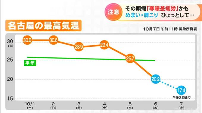 名古屋のこの1週間の最高気温を見ると、先週末は30℃を超えていましたが、6日は、20.2度と10度以上の差になりました。さらに7日は午後3時までに17.4度。