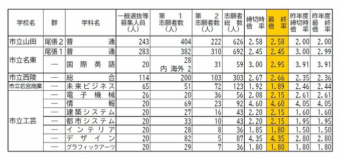 Bグループ 千種、瑞陵、中村、旭野などの志願状況・倍率