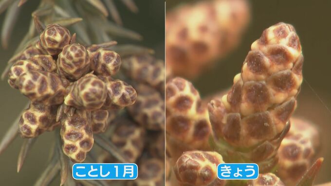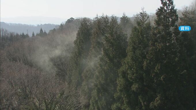 きょうは時折、強い風が吹くと花粉が煙のように舞い上がっていました。きょう取材した場所のスギの木は、雄花のほとんどが開いた状態になっていました。