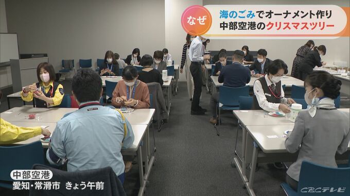 13日は空港で働くスタッフらおよそ80人が、工場などの廃材から作られたプラスチックチップなどを使って、クリスマスツリーのオーナメントを手作りしました。
