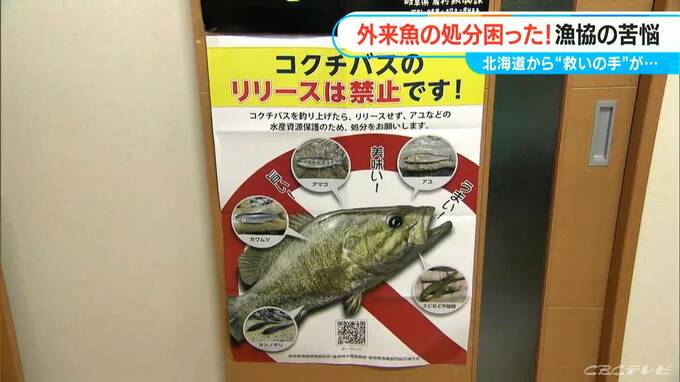 壁には別の外来魚、コクチバスの駆除を呼びかける県の大きなポスター。
