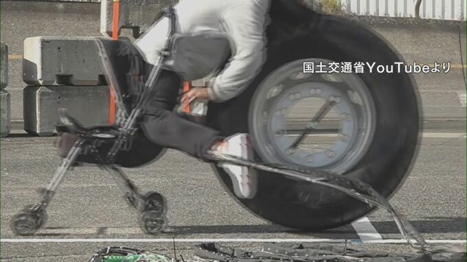 国土交通省が公開している動画では、重さ約90キロの大型車のタイヤが外れて歩行者に衝突する想定で実験。実験に使われた人形は後ろから転がってきたタイヤに沿うように折れ曲がり、頭もタイヤに打ち付けられました。