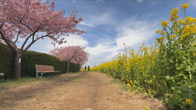 一足早い“春” 河津桜と菜の花の共演 ピンクと黄色のコントラスト 愛知・田原市 2025年3月19日(水) 16:17 国内 春の訪れを告げる、濃いピンクと鮮やかな黄色。この2色を、一度に楽しめる場所が、愛知県田原市にあります。300本の河津桜と、絨毯のように咲く菜の花が、春を感じたい人たちを引き寄せています。ことしは寒い日が…