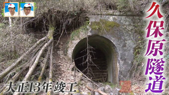 県道406号の脇にある細い道を進むと、現れたのは、大正13年(1924年)竣工の「久保原隧道」。平成2年(1990年)に現在の県道が供用開始されるまで使われていたそうで、坑口付近には崩れ落ちた石が転がっています。