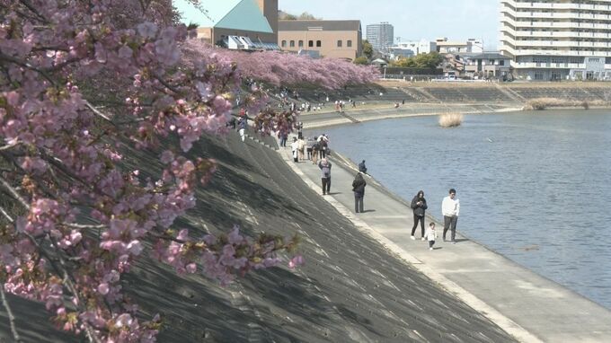愛知県岡崎市の中心部を流れる乙川沿いで、早咲きの河津桜がようやく満開となっています。