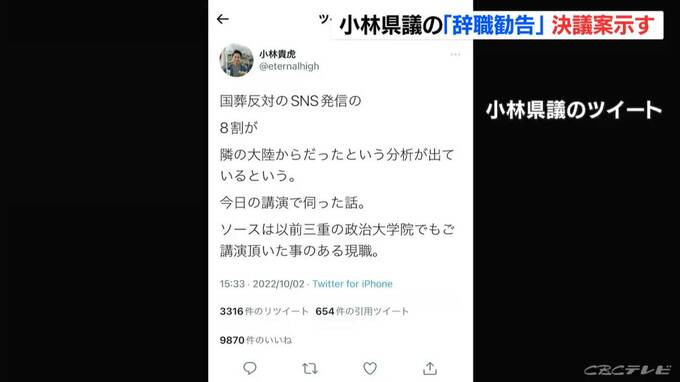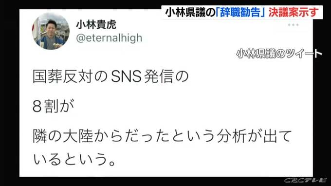この問題は自民党の小林貴虎(こばやし・たかとら)三重県議(48)が10月2日、自身のツイッターに安倍元総理の国葬について「国葬反対のSNS発信の8割が隣の大陸からだった」と投稿し、10月6日には「事実と違うところがあった」などと投稿を撤回したものです。