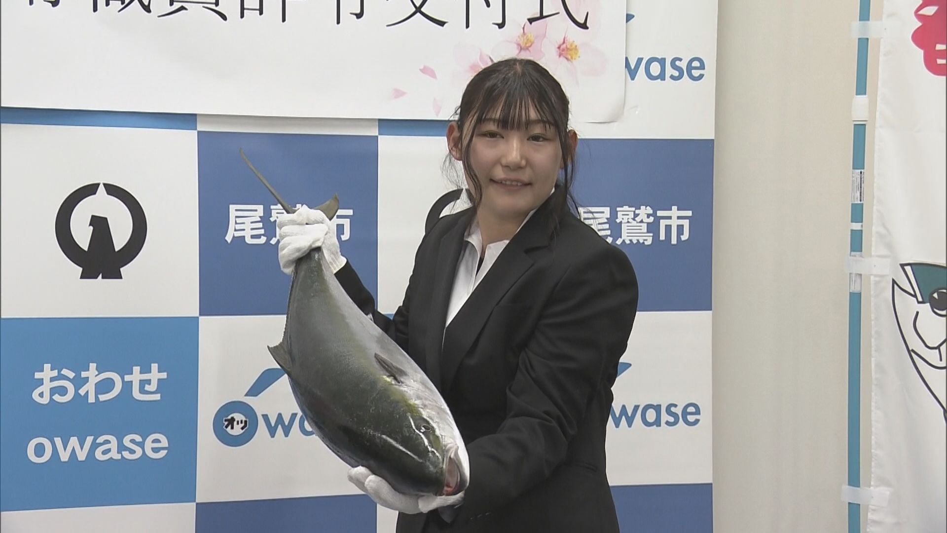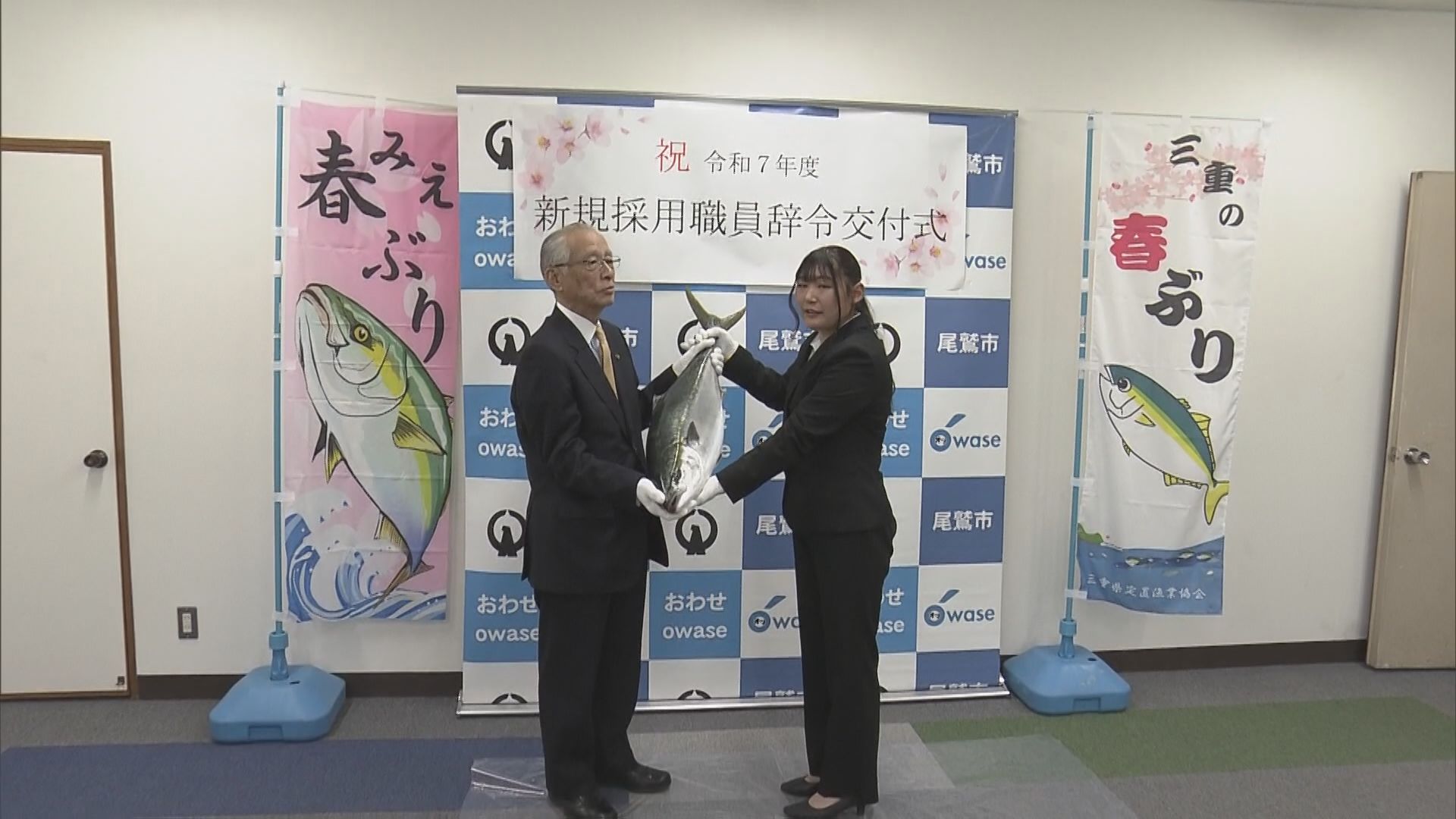 「大きくなって出世してください」 市役所の入庁式で新職員に出世魚のブリを贈呈 三重・尾鷲市