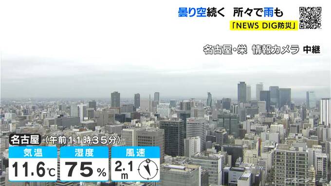 名古屋市内の雨は止みましたが雲が広がっています。午前11時35分現在の気温は11.6℃、湿度は75%で風は強くありません。