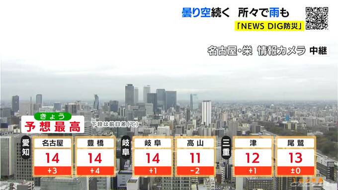 最高気温は名古屋や豊橋、岐阜で14℃、高山で11℃の予想です。きのうより高くなる所が多いですが、夜は空気がヒンヤリするでしょう。