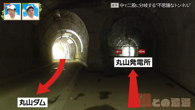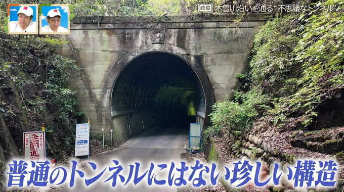 コンクリート製で一般的なトンネルのように見えますが、天井が高く、トンネル内で二股に分かれている不思議な構造をしています。2人はトンネル内を歩いて、じっくり観察することに。