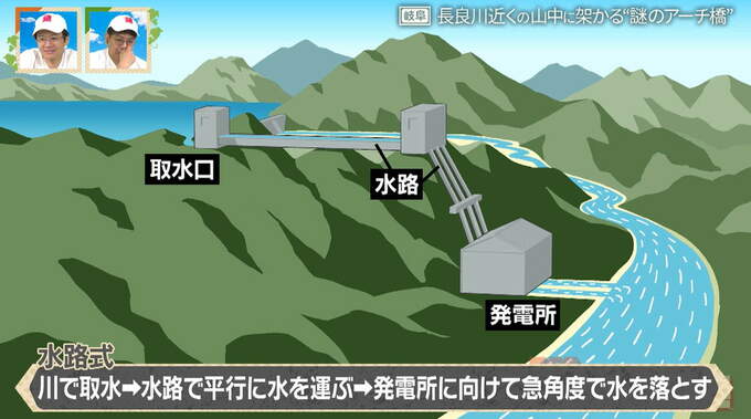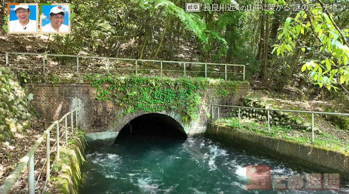このアーチ橋は上に水が流れる水路橋で、すぐ近くにある長良川水力発電所まで水を運んでいます。