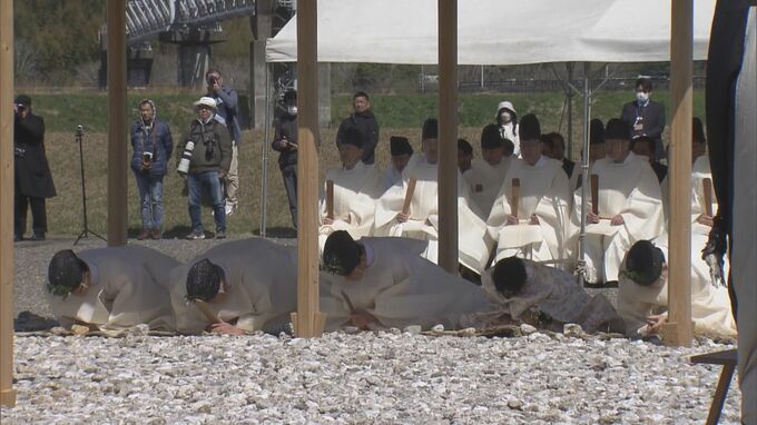 伊勢神宮の関係者や地元の奉仕会などおよそ80人が見守る中、お祓いを受け、身を清めた神職らは鍬を振り下ろす所作で神田を清め、「忌種(ゆだね)」とよばれるもみ種をまんべんなく撒いていきました。毎年この時期に行われる「神田下種祭」は1000年以上続くとされる伝統の祭典です。これから神田に水が入り伊勢地方は本格的な田植えが始まります。