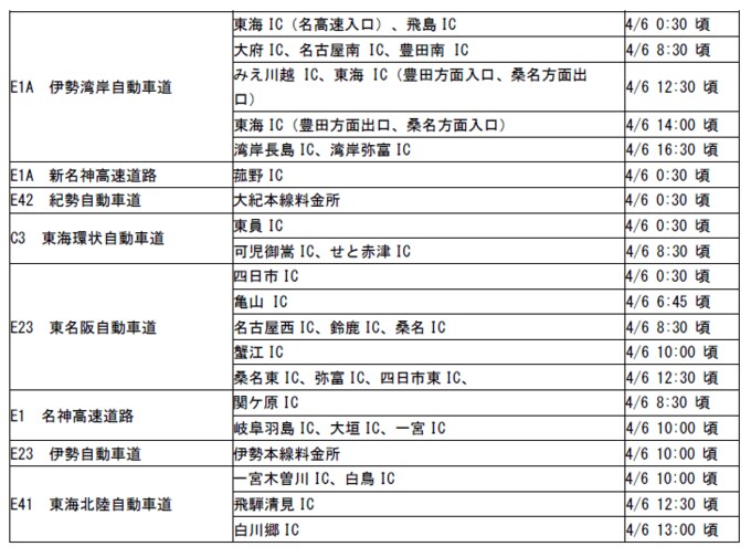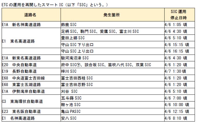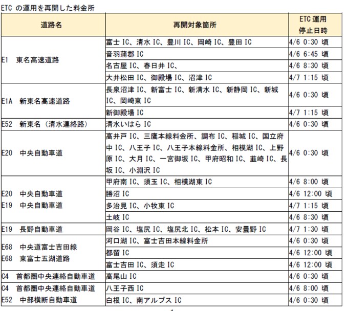 ETCの運用を再開した料金所、スマートICは以下の通りです(NEXCO中日本のHPより)。