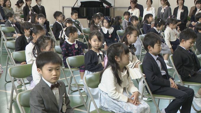 61人が入学した東区の東桜小学校では加賀幸一校長が「みんな仲良くして、芝生の校庭で元気に遊んでください」と歓迎の言葉を送り、子どもたちは小学生としての第一歩を踏み出しました。