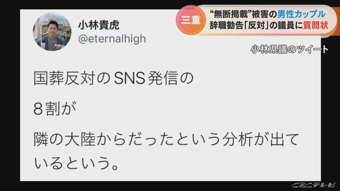 この問題は10月2日、三重県議会自民党の小林貴虎議員がツイッターに「国葬反対のSNS発信の8割が隣の大陸から」などと投稿したもので、19日、県議会本会議で小林議員に対する辞職勧告決議案が上程され、採決の結果、賛成22、反対23の1票差で否決されました。