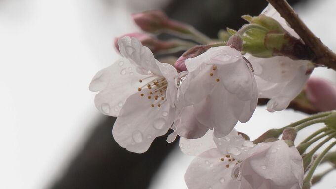きのう高山市で開花が発表された桜は、冷たい雨に打たれながら訪れた多くの観光客を迎えていました。