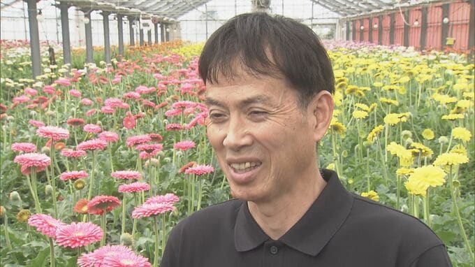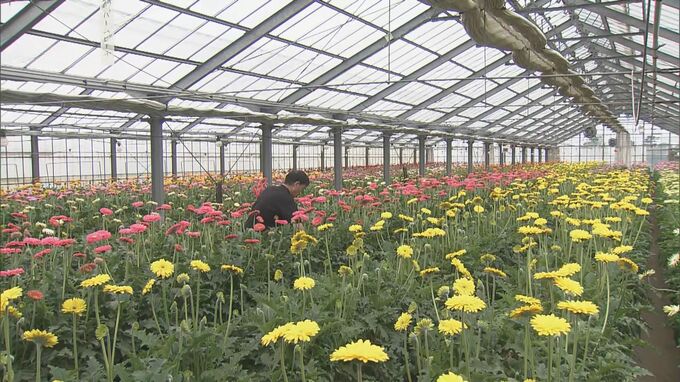 ハウス内で咲く色とりどりのガーベラ。花言葉は「希望」です。愛知県はガーベラの出荷量が全国4位で、豊川市の中西昌幸さんのハウスでも出荷の最盛期を迎えています。