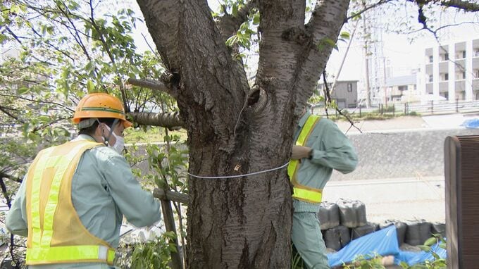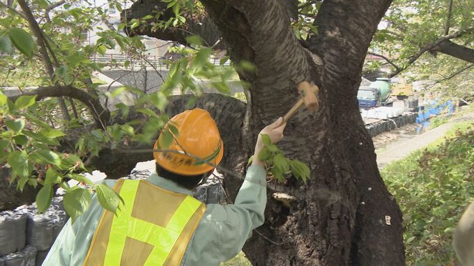 これを受け、市では山崎川沿いのサクラ約760本を対象に緊急点検を始め、土木事務所の職員が木槌で幹を叩いて、木に空洞や腐っている部分がないかなどを調べました。