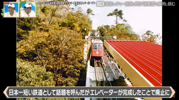 当時使われていた、「箕面温泉スパーガーデン」専用のケーブルカー。たった100mしかなく、日本一短い鉄道と呼ばれ話題を呼びましたが、エレベーターができたことで廃止になりました。