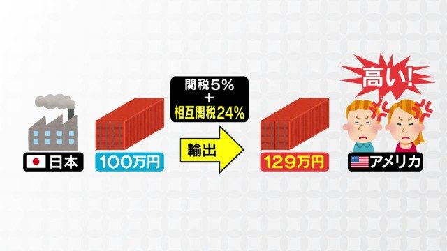 例えば5%の関税がかかっている製品を造り、100万円分アメリカに輸出する場合、関税は5万円です。ここに相互関税が加わると、24万円が上乗せされ、関税の総額は29万円になります。これを全て販売価格に転嫁すると、製品そのものから約3割増しの価格で売ることになり、日本の製品がアメリカで売れなくなる可能性があるのです。