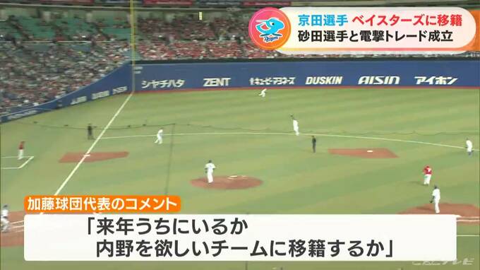 ドラゴンズがまたまた電撃トレードです。6年目、28歳の京田陽太選手(28)と、ベイスターズ砂田毅樹投手(27)のトレードが成立しました。