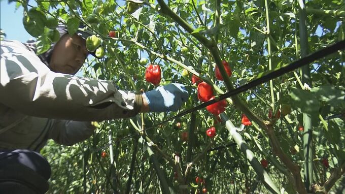 敷地内の畑では真っ赤に色づいた「ハバネロ」の実を1つ1つ丁寧に摘み取って収穫する作業が行われています。「ハバネロ」は暑さに強く、ことしも作柄は上々ということです。