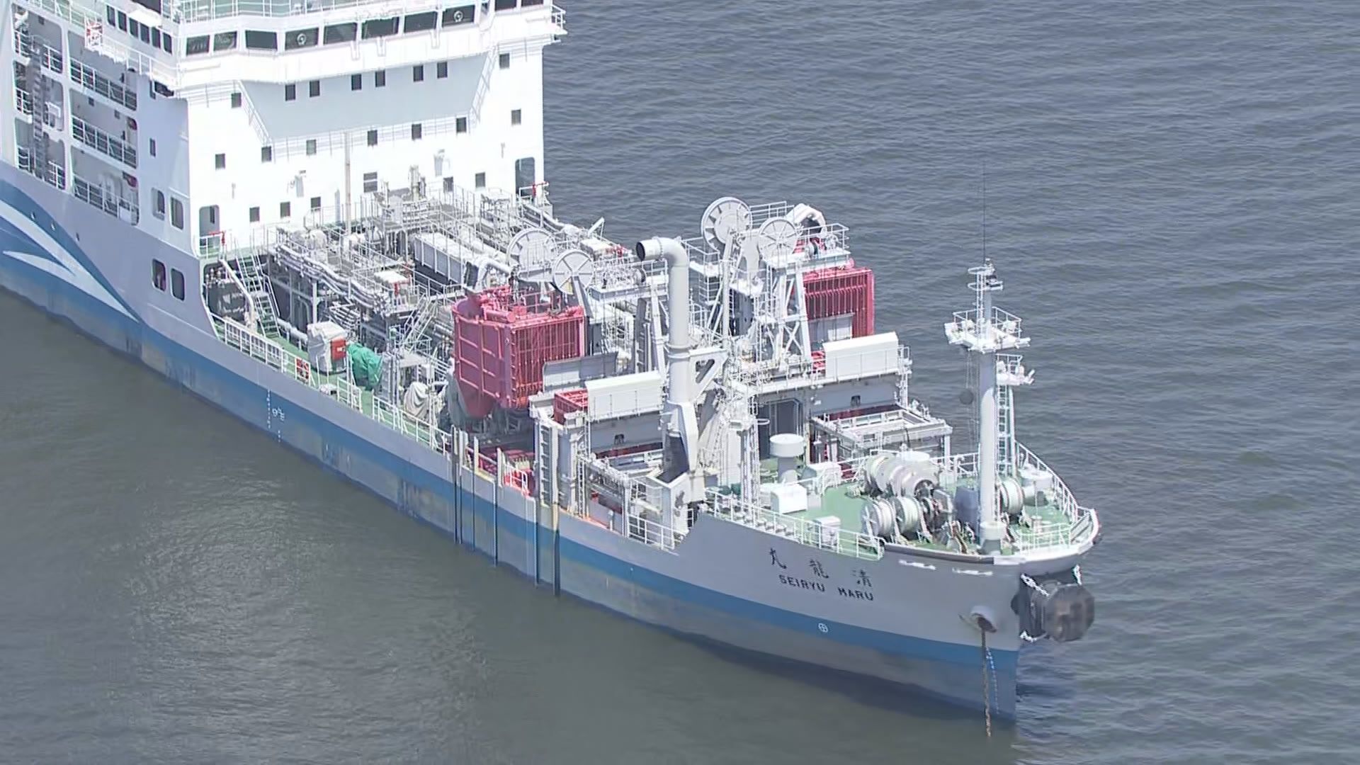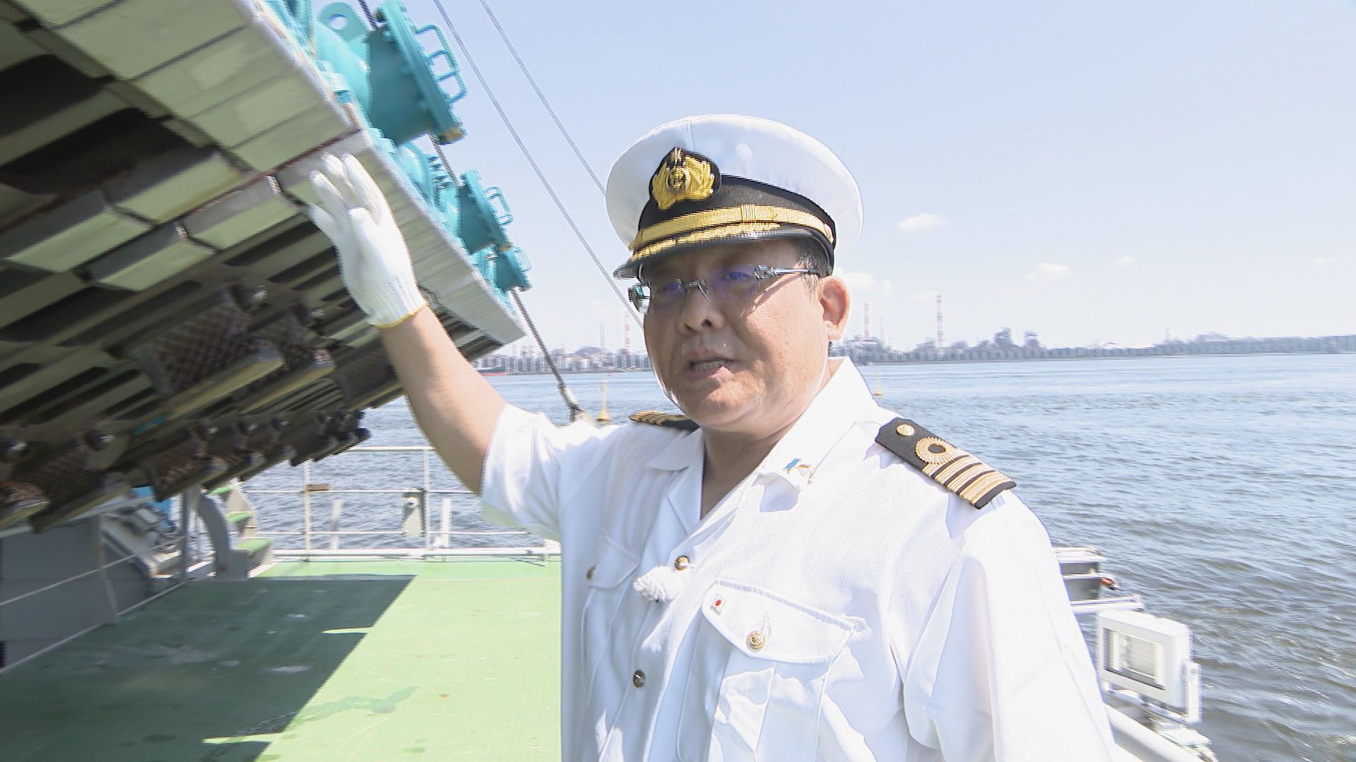 「名古屋港の海の上にやってきました。こちらに見えるのが浚渫(しゅんせつ)を行う清龍丸です。ここから見ても非常に大きいのがわかります」