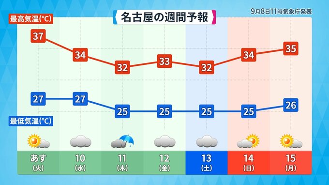 名古屋 年間の猛暑日日数が“過去最多”の48日に あすも最高気温37℃予想 9月に入っても熱中症に警戒を 2025年9月8日(月) 12:32 国内 名古屋は午前11時50分頃に35℃を超えて、きょうも猛暑日となり「年間猛暑日日数」が観測史上最多の48日になりました。 名古屋では、あすも最高気温37℃予想で、引き続き熱中症に警戒が必要です。