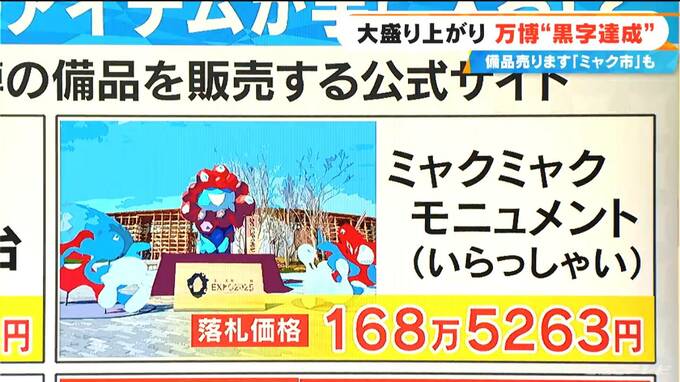 大阪・関西万博 チケット販売“黒字化ライン”クリア 「ミャクミャクモニュメント」など設備・備品をオークション形式で販売 行列で見かけたあんなものまで… 2025年10月9日(木) 15:13 国内 (若狭敬一アナウンサー)「大阪・関西万博」は閉幕が近づくにつれ入場者が増えていますね?(大石邦彦アンカーマン)人間の心理は「もう終わる」と思うと「行きたい」に変わるんですね!完全にスイッチが入った人…