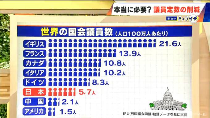 世界の国会議員数、人口100万人当たりで計算していくと、多いのは、イギリス21.6人、フランス13.9人、続いてカナダ10.8人、ヨーロッパに戻ってイタリア10.2人、ドイツ8.3人、そこに続いて日本は「5.7人」ということで、実は世界で比べるとかなり少ない。