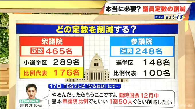 吉村代表は「やるんだったらもうここですよ。臨時国会12月中にもう成立させたい。基本、衆議院議員の比例でもいい。1割くらいというのは衆議院の1割、50人ぐらいを削減したい」と述べています。