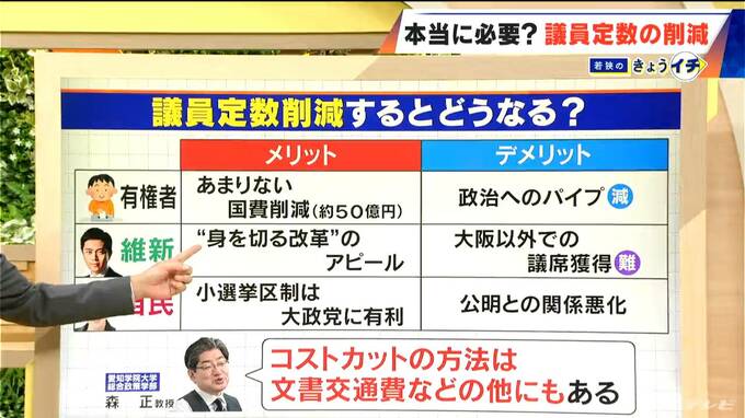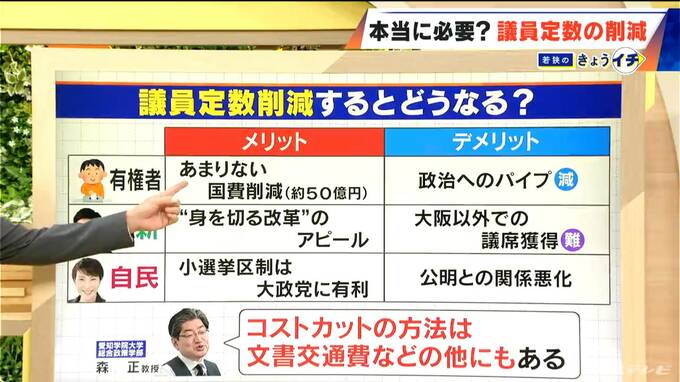 まず有権者にとってのメリットなんですが、いきなり「あまりありません」と森教授。強いて言うならば、国費が削減される、政治家1人当たり、国会議員年間で大体1億円ぐらいかかるので、掛ける50、50億円ぐらいは浮くということです。