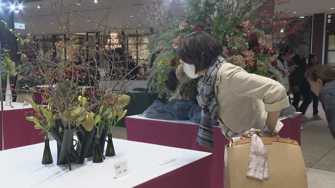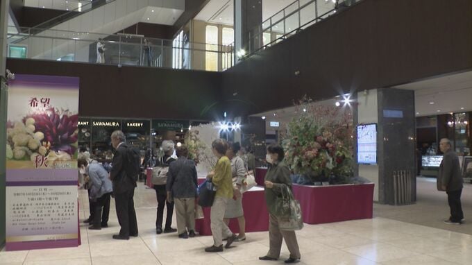 ミッドランドスクエアで開催されている「秋の花道展」は、17の流派や団体の華道家による生け花約50点が並び、今回で33回目です。