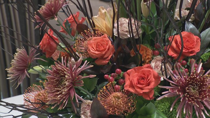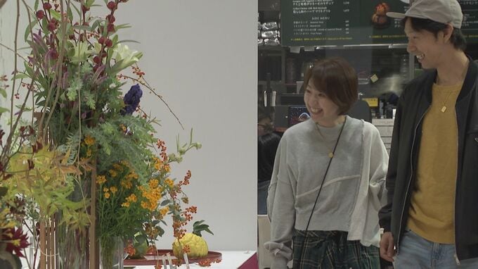 会場は、ハロウィーンをイメージした生け花など秋らしい色鮮やかな展示で飾られ、訪れた人は写真を撮りながら楽しんでいました。