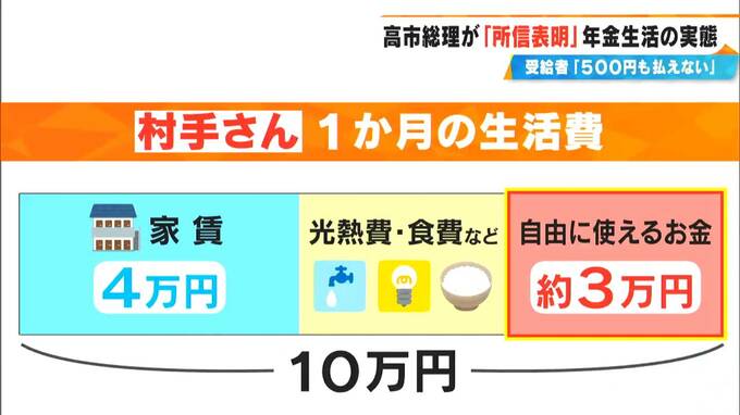 収入は2か月に1度支給される20万円の年金のみ。家賃の4万円と光熱費・食費などを除くと月々に使えるお金は約3万円です。