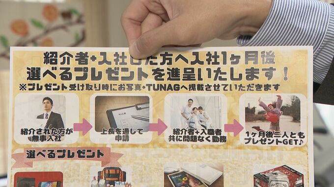 また、人材確保もあの手、この手です。来月からは採用の際、紹介者と紹介されたそれぞれの職員に米50キロなどが選べるプレゼントキャンペーンに参加してもらう予定です。