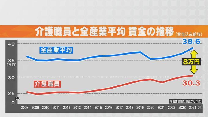 厚生労働省の調査によると、介護職員の昨年の平均月給は30万3000円。前年からは3000円ほど増額しましたが、賃上げの流れが進む全産業平均と比べると、8万円ほど低く、大きな開きがあります。