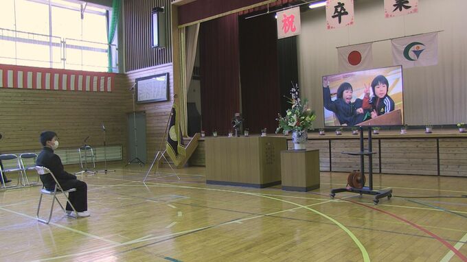 新型コロナ対策のため、合唱が中止されるなど制限下で行われた卒業式となりましたが、スライドショーに6年間の思い出が映し出されるなど、在校生や先生・そして地域の人たち全員で門出をお祝いしました。