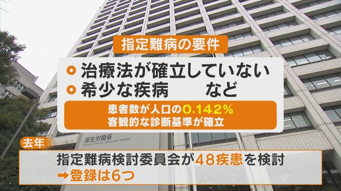 しかし国の難病指定には高いハードルが。現在小児慢性特定疾病の指定を受けているのは788疾患に対し、指定難病はおよそ半分の338疾患。認定要件には「治療法が確立していない」「希少な疾病である」など、国の厳しい審査が必要です。昨年申請された48疾患のうち、追加登録は6つだけでした。