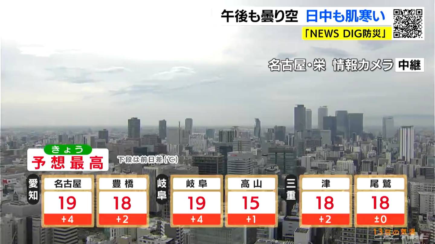 正午前の名古屋市内は、厚い雲が広がっています。けさはきのうのような冷え込みにはなりませんでしたが、日差しが届かず肌寒さは続いています。午後も曇り空が続くでしょう。