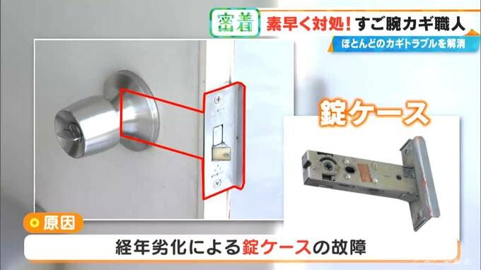 カギを知り尽くしている丹羽さん。すぐに原因を特定。カギ本体の錠ケースと呼ばれる部品の故障で、経年劣化による不具合なんだそう。