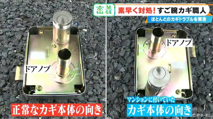 「(カギが)上下逆に付いている。普通はカギ穴がノブの上だけど、逆さまに付いていたから」