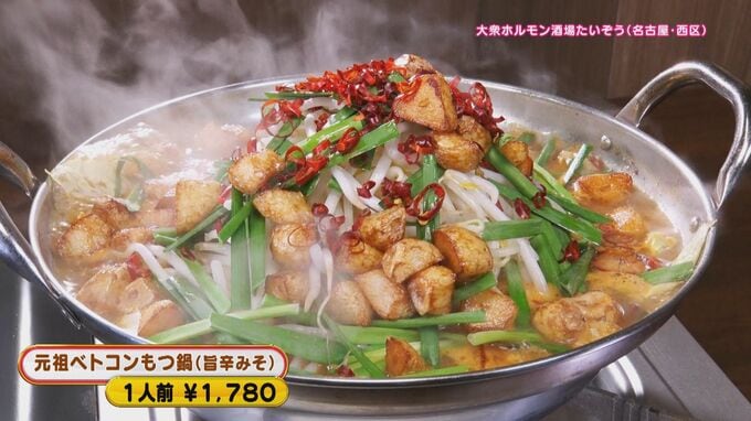 一番人気は、店主が開発した“新たな名古屋名物の鍋”という「元祖ベトコンもつ鍋(旨辛みそ)」(1人前1,780円)。この“食べるとベストコンディションになるもつ鍋”、略して“ベトコンもつ鍋”は、カツオがベースの旨辛スープに、インパクト抜群の揚げニンニクが2人前でなんと約40個も!