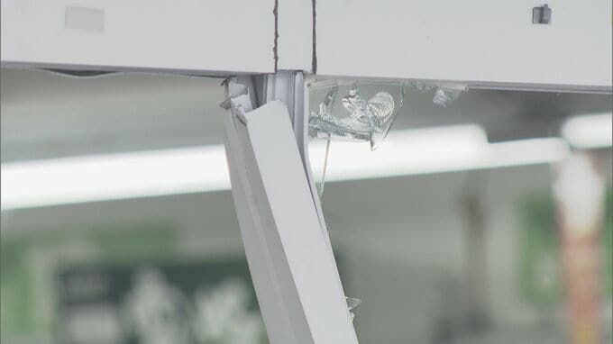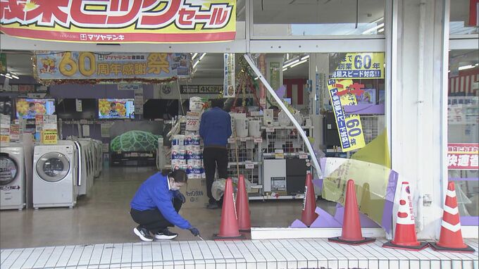 店の出入り口のガラス3枚が割れ、店内に陳列されていた商品のファンヒーターが散乱しました。