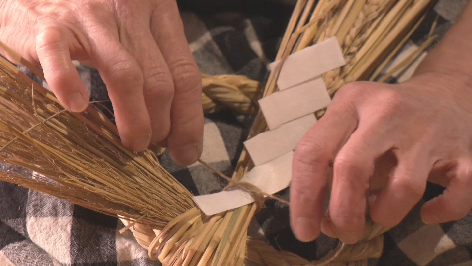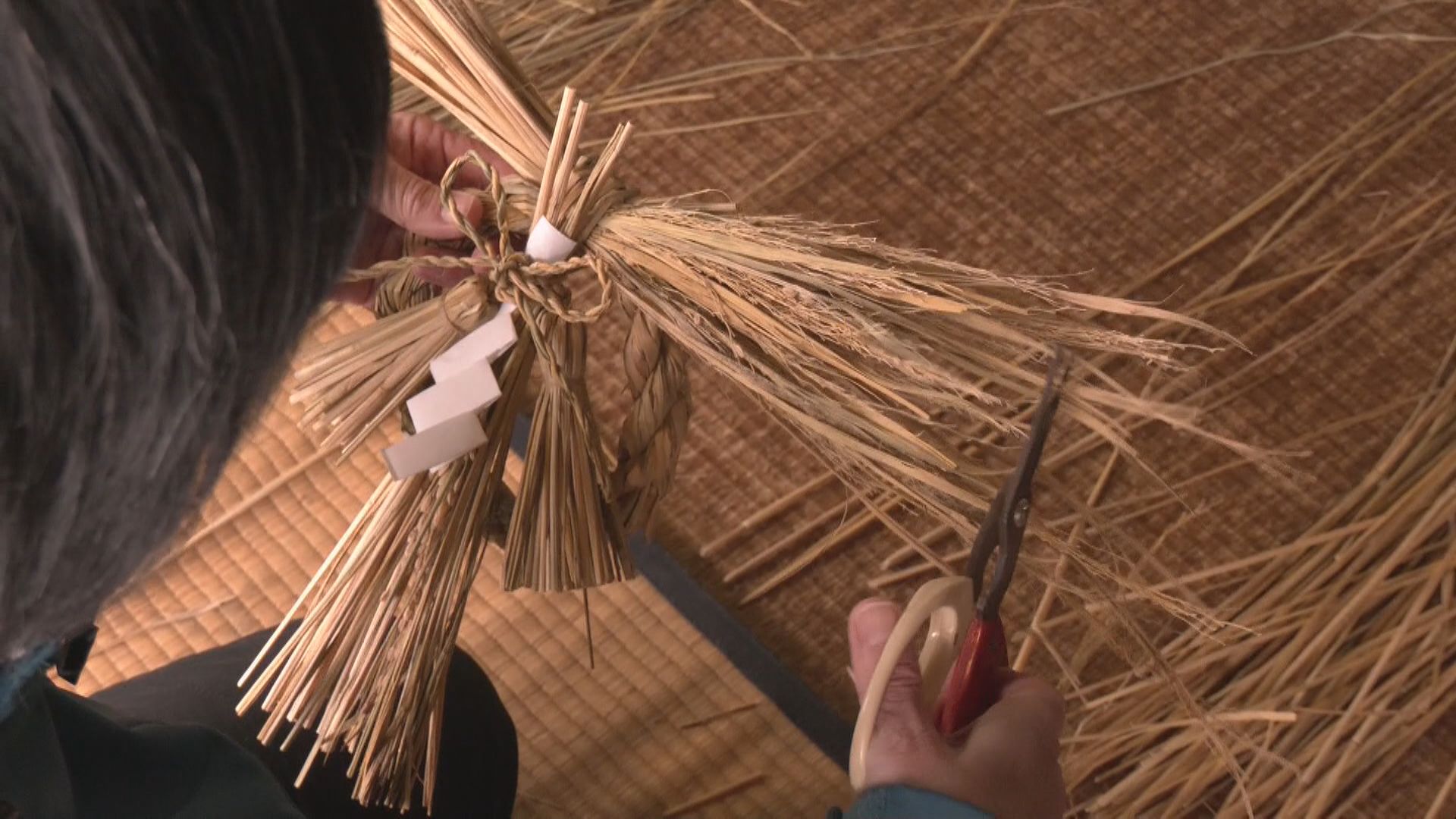 岐阜県高山市の「飛騨の里」で、しめ飾りを作る体験教室が開かれました。もち米のわらで編んだしめ縄を丸くして、飾りを付けていきます。
