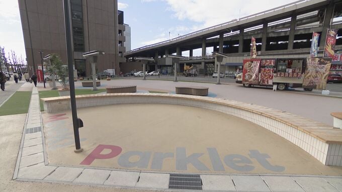 「ベンチのところに『再開発を見据えてしばらくの間、ほっと一息つけるウォーカブルな空間Meieki Parkletとして整備しました』と書かれたプレートがあります。しばらくの間というのは、どのくらいの期間になるのでしょう」