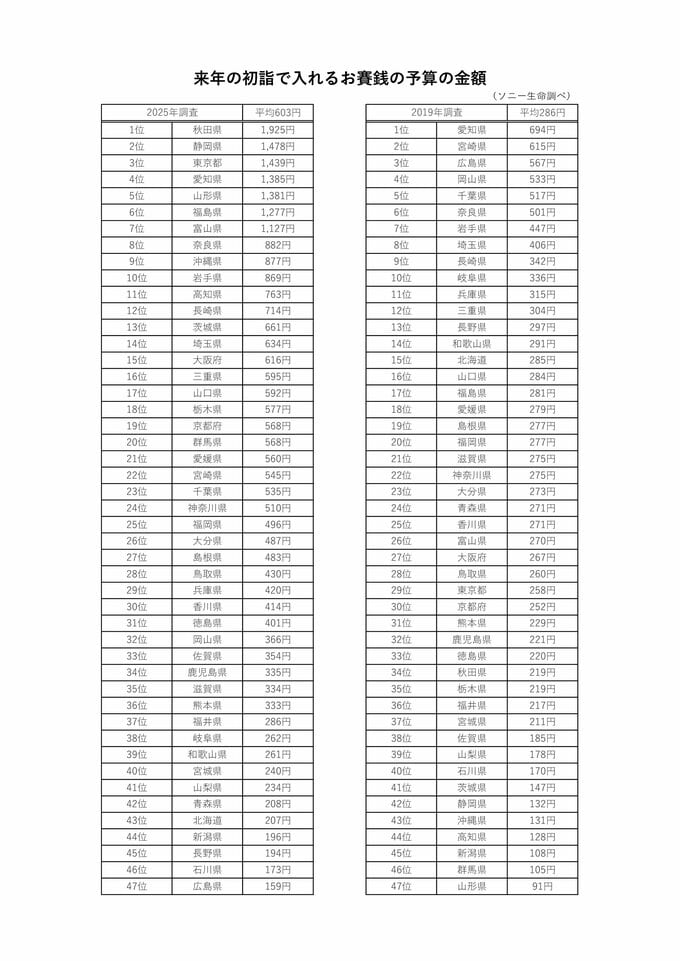 初詣“お賽銭の予算”全国ランキング あなたの街はいくら?前回1位は「愛知」 今回はどの都道府県が1位に?物価高でも予算は大幅増 「ウマくいく年に…」 2025年12月31日(水) 15:02 国内 “お賽銭予算”ランキングを見る