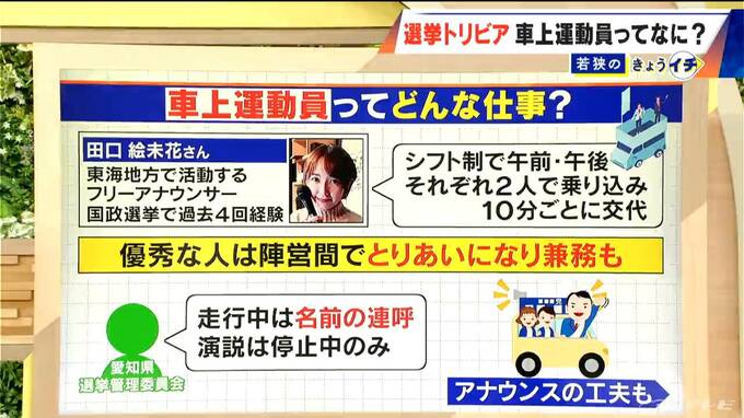 東海地方で活動するフリーアナウンサーの田口絵未花さん。国政選挙で過去4回、車上運動員として活動した経験があります。
