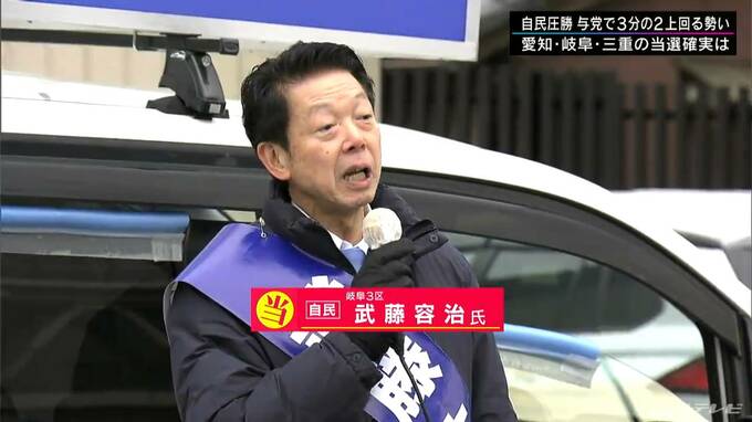 【衆議院選挙】岐阜3区 武藤容治氏(自民)に当選確実 2026年2月8日(日) 20:09 国内 岐阜3区で当選を確実にした、自民党 前職の武藤容治さん。経済産業大臣を務めた経験を前面に「日本のものづくりを守る」と訴えました。個人演説会を中心に選挙戦を展開し、7回目の当選を確実にしました。
