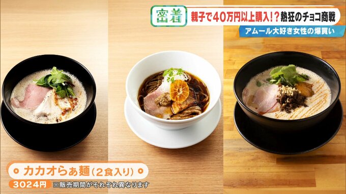 去年のアムールから販売され、“カカオを麺に練りこむ”という斬新な発想と、そのおいしさの虜になったという花井さん。1パック2食入り、約3000円のラーメンもまとめて買い。そのほか、クッキーやチョコレートなども合わせて、合計で約3万円分を購入。